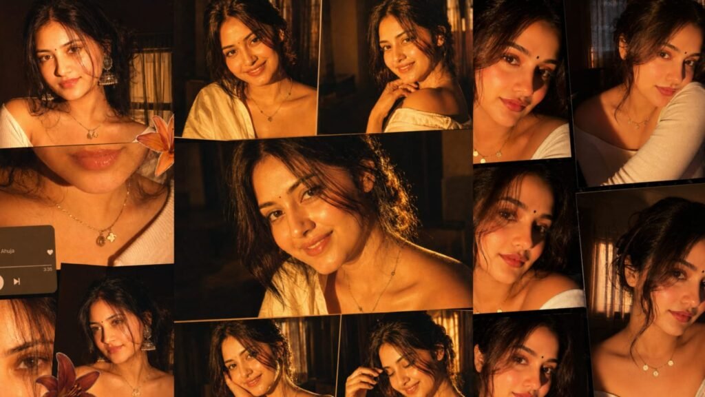 PROMT – Ultra-realistic cinematic collage of a young woman using the uploaded face exactly. The image is composed of multiple rectangular photo panels layered vertically and diagonally, creating a scrapbook-style layout. Each panel shows close-up and mid-shot portraits of the same girl in a dim indoor room. Lighting: strong, warm, golden-orange direct flash lighting hitting the face from the front-left, creating high contrast, deep shadows, and a glowing skin effect. Background remains dark with visible window curtains slightly illuminated. Harsh highlights on cheekbones, nose, and lips. Slight film grain and soft blur for a dreamy vintage feel. Color grading: intense amber, burnt orange, and golden tones dominating the entire image. High saturation, slightly crushed blacks, and glowing highlights. Subject styling: messy tied-back hair with loose strands falling on face, glossy lips, subtle eyeliner, dewy skin. Wearing a delicate necklace with small pendants and a casual off-shoulder white top. Composition details: Top panel: serious expression, looking directly at camera. Middle panel: cropped lips and necklace close-up. Bottom left: extreme close-up of eyes with strong shadow split across face. Bottom right: angled portrait with soft side gaze. Panels overlap slightly with uneven spacing for aesthetic collage look. Overlay elements: Add realistic flower stickers (lilies in orange, cream, and red tones) placed around the collage. Add a music player UI card in the center-left area with a soft rounded design. Music player text: Title: “Khat†Artist: “Navzot Ahuja†Include minimal playback bar and icons (play/pause, skip). Final touches: Slight glow/bloom effect on highlights Subtle vignette around edges Flash photography look, like taken on a digital camera at night Maintain natural skin texture, avoid over-smoothing