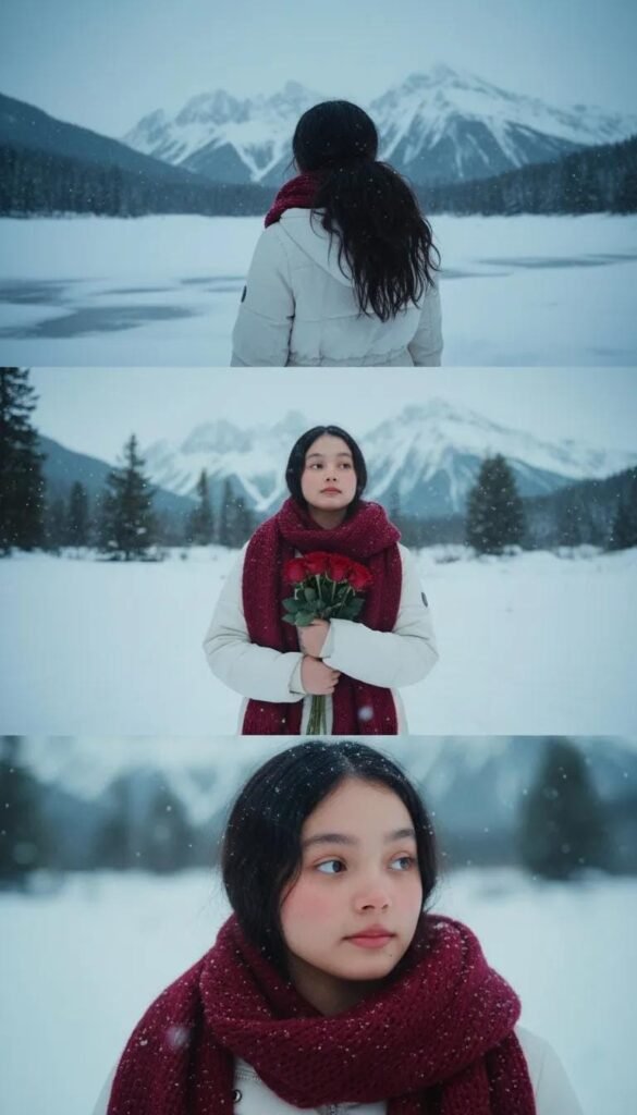 Promt – Maintain all original facial attributes exactly as uploaded reference image. Create 9:16 cinematic vertical triptych of woman in snowy winter scene. Top: extreme close-up on warm eyes with frost crystals on eyelashes, skin luminous with natural cold flush. Middle: medium shot from side angle, she holds transparent umbrella while snow dances around her dark hair and white scarf. Bottom: frontal portrait with serene expression, snowflakes melting on flushed cheeks and nose.
