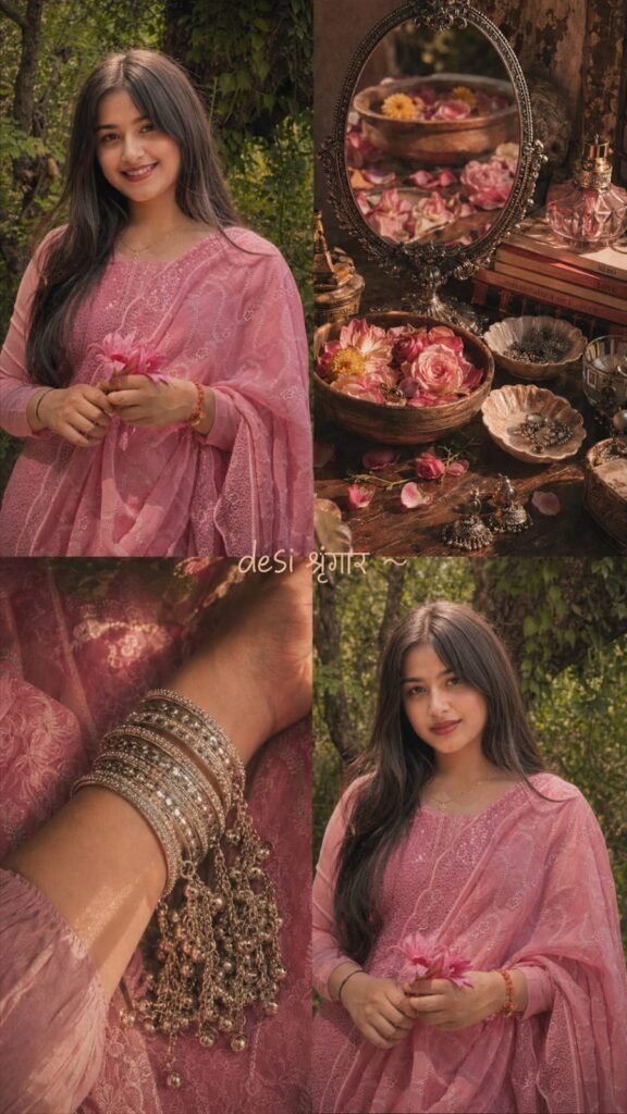 PROMT – Use the uploaded face exactly.Top Right Frame: A nostalgic, cluttered vanity tabletop with a 90s film aesthetic and warm vintage grain. In the center, an ornate silver oval mirror reflects a wooden bowl filled with pink rose petals and yellow marigolds. Next to it sit a stack of old books, a pink geometric perfume bottle, and small seashell dishes holding silver oxidized jewelry.Loose flower petals and a pair of traditional jhumka earrings are scattered across the dark surface. The lighting is low and warm,like candlelight.High-quality textures, dreamy and romantic atmosphere, Desi-core aesthetic. Keep lighting warm and soft. Bottom Left Frame: A high-angle, cinematic close-up shot of the girl’s arm and hand, The girl is wearing a large, elaborate stack of silver and glass bangles (chura), featuring metallic silver bands paired with intricate “kaleere”-style hangings consisting of delicate silver chains and small spherical bells (ghungroos).The hand rests against the fabric matching the dupatta from above.The scene is bathed in warm, direct golden hour sunlight, creating sharp shadows and bright highlights on the silver jewelry. The image has a soft, dreamy film-grain texture, capturing a romantic and traditional South Asian aesthetic. The overall mood is warm, intimate, and ethereal. Bottom Right Frame: Same girl sitting in the same garden again but now looking directly at the camera with a neutral, soft expression.Same outfit, same lighting, same background style.Overall Style: Warm vintage filter (yellowish tint) Soft flash photography look Slight grain for aesthetic feel Cozy, dreamy, desi vibe Keep all tones consistent across frames Add subtle aesthetic text: “desi शृंगार ~” in a soft handwritten style Important: Face must match uploaded image exactly. Maintain identical outfit, jewelry, and vibe across frames. Ensure seamless collage layout (2×2 grid), aspect ratio should be 9:16.